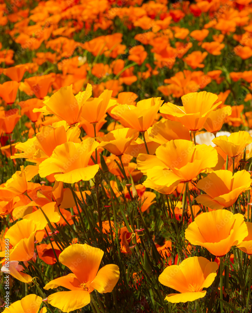 Cluster of vibrant orange California poppies closeup, with many more orange poppies in background, selective focus, dramatic, Eschscholzia californica, details, wildflowers, California state flower