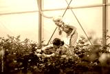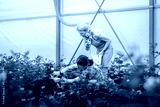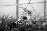 Two women working in the flower greenhouse selecting roses for pollination to create a new variety.