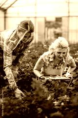 Two women working in the flower greenhouse selecting roses for pollination to create a new variety.