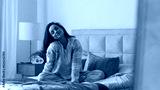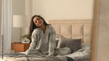 Caucasian European woman sitting on bed stretching good morning cheerful bedroom inside mirror pajamas cozy comfortable wellness carefree weekend relax resting awaken domestic holiday pleasure delight