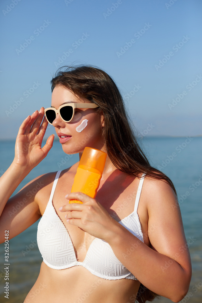Beautiful woman applying cream sunscreen on tanned face. Sunscreen. Skin and body care. The girl uses a sunscreen for her skin. Portrait of a female holding suntan lotion and moisturizing sunscreen.