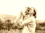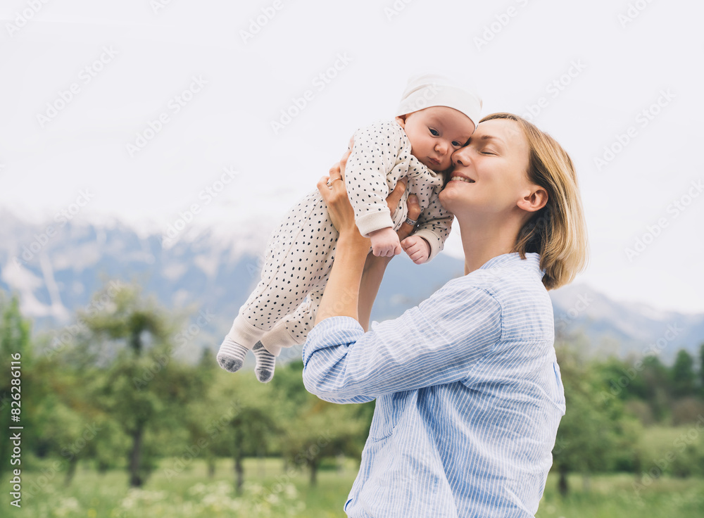 Mother and baby walking on nature outdoors. Family in green nature background. Loving woman with child in countryside. Concept of green parenting, natural motherhood, postpartum period.