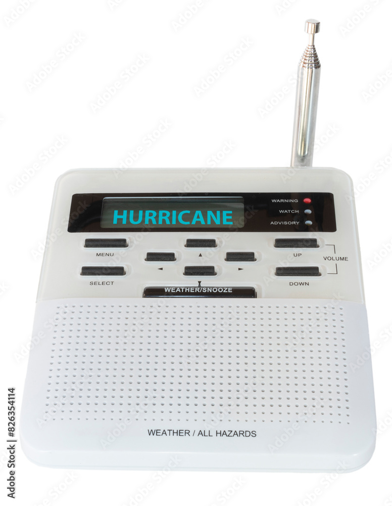 Hazards and weather radio showing a hurricane warning