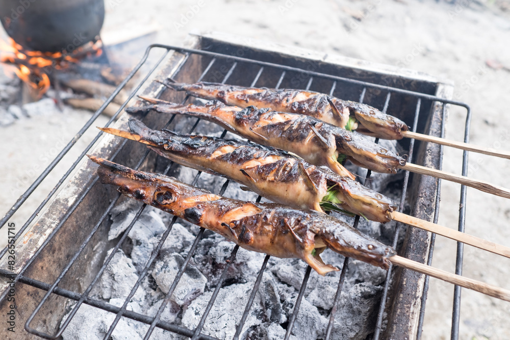 Cooking bunch of delicious skewered homegrown or farm-raised catfishes over burning charcoals using portable aluminium grilling stove outdoor. Selective focus. Copy space.
