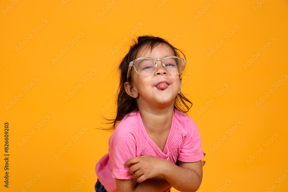 A young child standsplayfully sticking out their tongue. The child is wearing a pink shirt and large, clear-rimmed glasses, showing a fun and mischievous expression.
