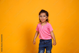 A young child with a bright smile . The child is wearing a pink shirt and large, clear-rimmed glasses. They have their open hand , looking cheerful and adorable.