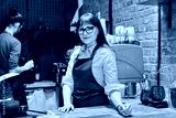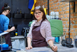 Female business owner in apron standing behind bar counter in coffee shop cafeteria