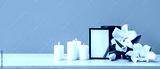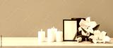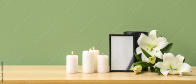 Blank funeral frame, burning candles and beautiful lily flowers on wooden table near color wall
