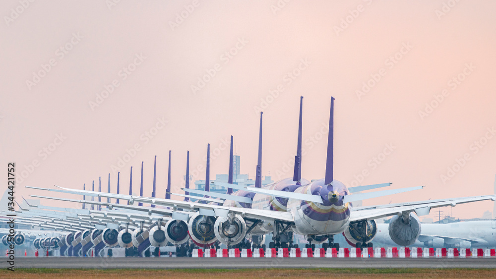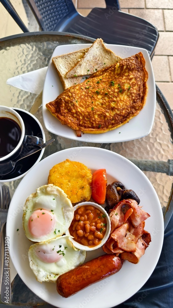 Traditional Big breakfast with fried eggs, sausages, bacon, bean, French toast, bread and black coffee.