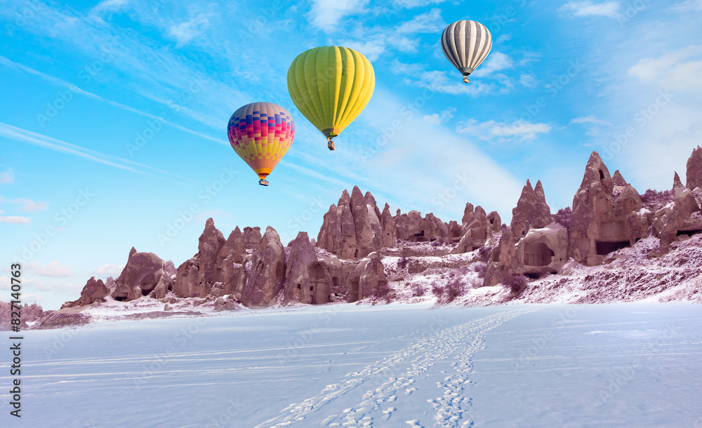 Hot air balloon flying over spectacular Cappadocia - Rock formation in Cappadocia following a heavy snow fall. Everything covered snow under sunset sky