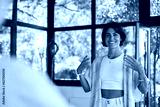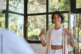 Young happy woman yoga coach training group class yoga meditation session sitting in yoga pose in studio speaking to community teaching people during retreat holistic mind body health therapy.