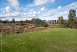 Large green grassy outdoor space in a suburban local park with a water creek running under a bridge and residential houses in the distance. Beautiful living environment in an Australian neighborhood.