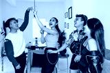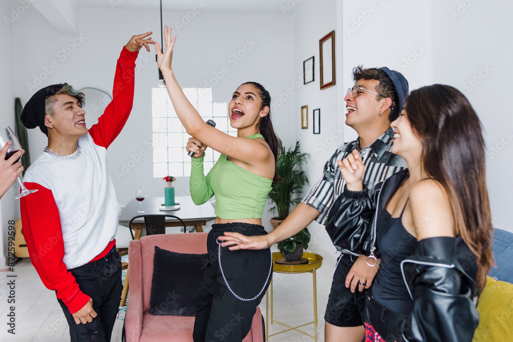 Young latin LGBT friends celebrating gay pride month holding rainbow flag at home in Mexico, Hispanic homosexual people from lgbtq community in Latin America