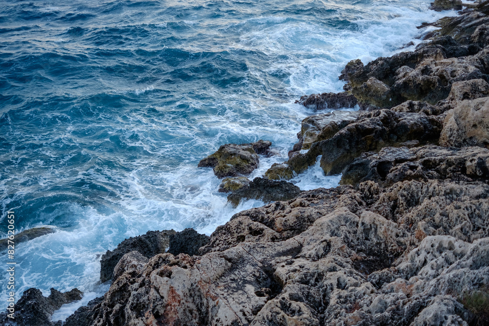 Beautiful view of water crashing on the rocky shore. Wave splashing against stones on shore close up.