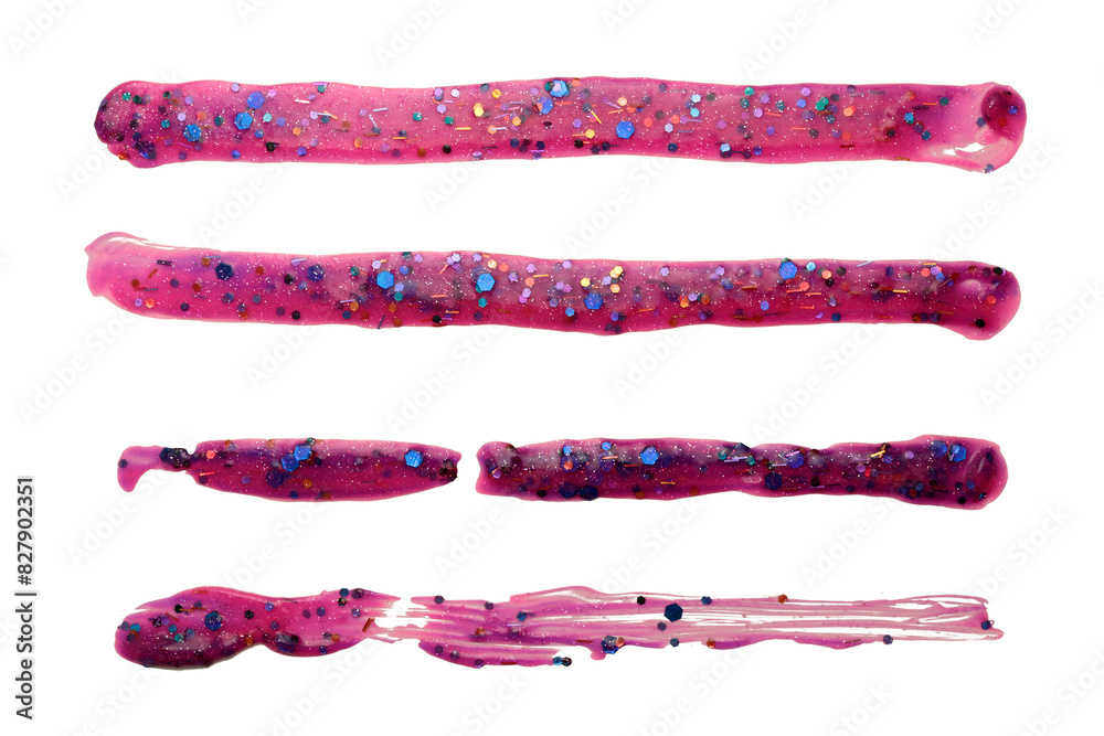 Pink glitter gel color smear brushstroke stain line blot isolated on white background.