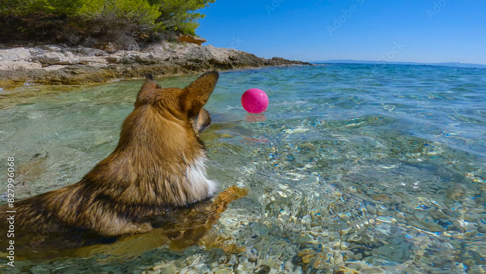 A lively mixed breed dog plays with a pink balloon in the crystal clear blue Adriatic Sea. Excited young doggo is jumping and swimming after a new toy. Furry pet enjoys a summer day on beautiful beach