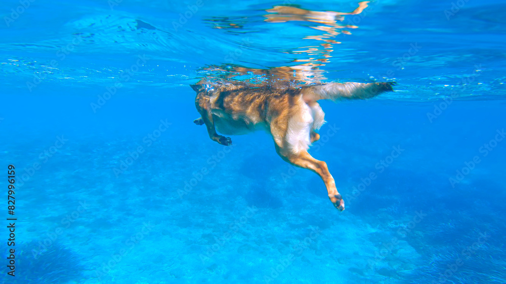 UNDERWATER: Following a brown dog swimming in crystal blue water of Adriatic Sea. A look at the paws of an adventurous doggo, who enjoys a swim in vibrant seawater during summer holidays in Dalmatia.