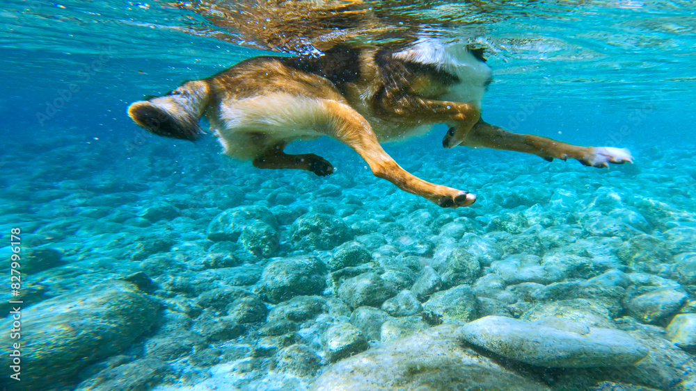 UNDERWATER: Adventurous dog swims in crystal clear blue sea above rocky seabed. A look at the paws of a brown doggo, who enjoys a swim in stunningly clean marine environment along the Dalmatian coast.
