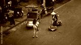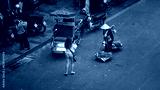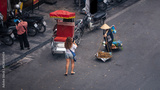Aerial of tourist woman take photos with smartphone of Vietnamese street vendor