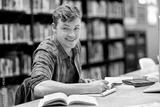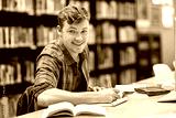 Student, portrait and notebook in library for study, education and university quiz with pen on table. Man, happy and books on school campus for college exam, research and learning with scholarship