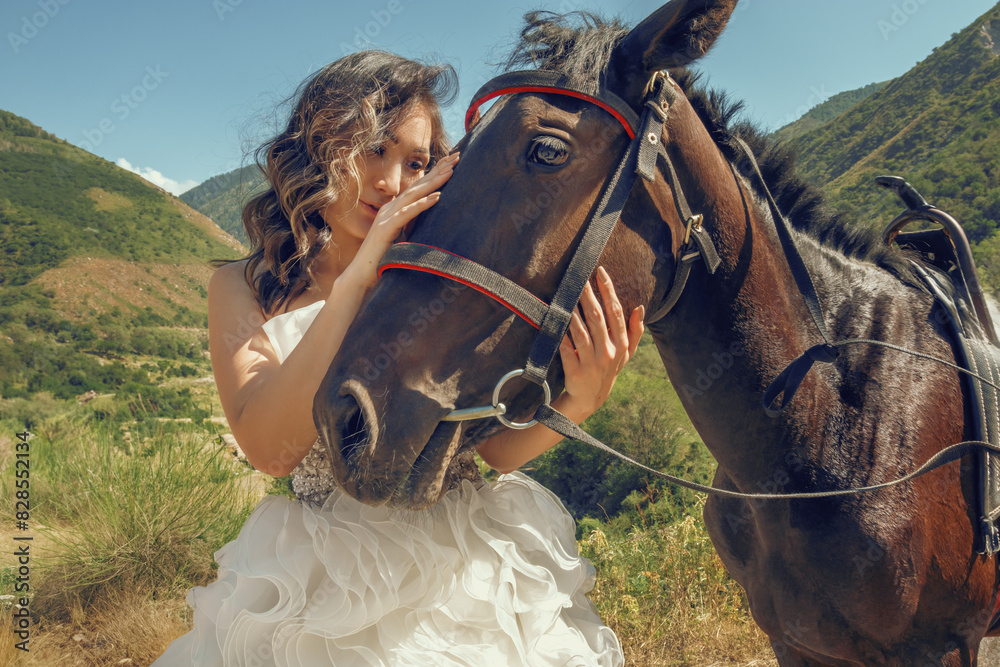 A bride in an elegant white dress tenderly caresses her horse.
