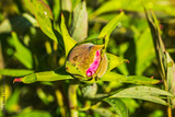 Close-up of a red peony bud unfurling under spring raindrops.