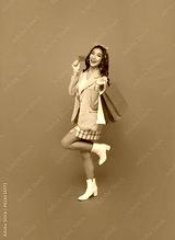 Happy pretty Asian woman carrying colorful shopping bags with credit card isolated on pink studio background.