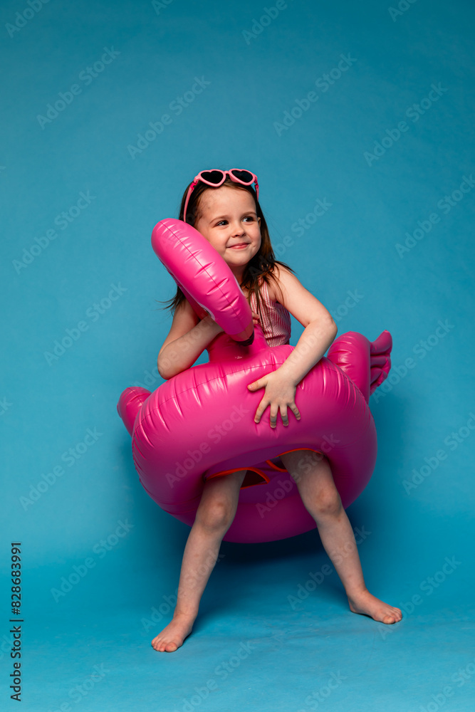 Happy child girl in pink swimsuit with swimming ring flamingo on a colored blue background. Travel, summer beach concept.