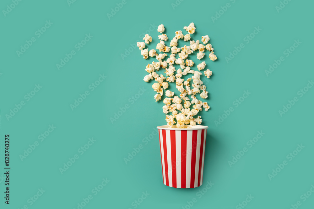 Popcorn bucket, movie theater entertainment, film snack classic box,green background, copy space