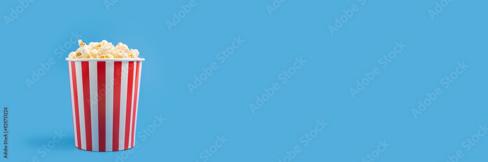 Popcorn bucket, entertainment box, tasty theater treat, film grain,blue background, banner
