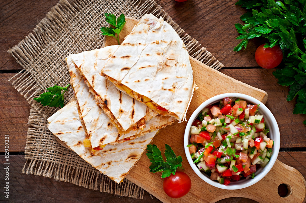 Mexican Quesadilla wrap with chicken, corn and salsa