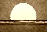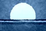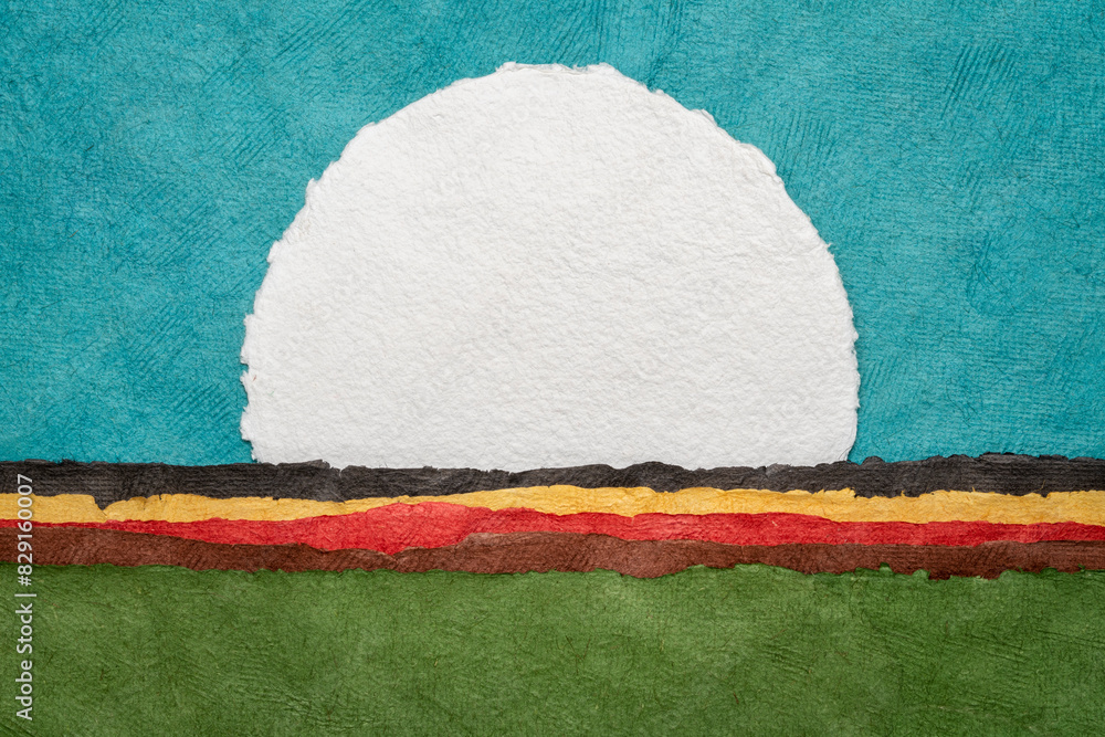 moon or sun rising over abstract colorful landscape, blank circular watercolor paper