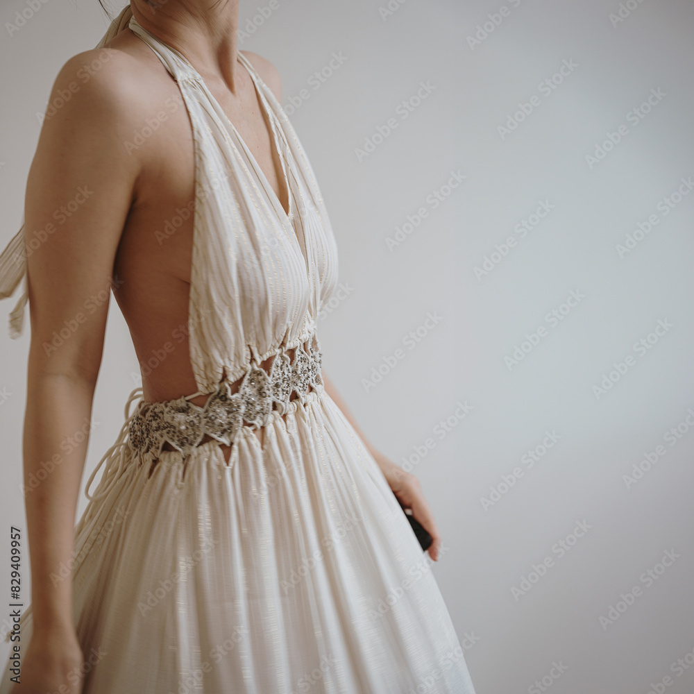 Beautiful white woman wearing elegant neutral creamy beige evening dress over white wall. Aesthetic fashion concept for magazine, boutique, shop branding. Mock up with copy space