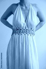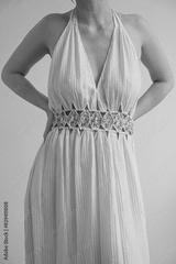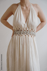 Young pretty woman in cream beige evening dress against the wall. Aesthetic fashion design