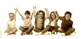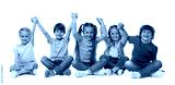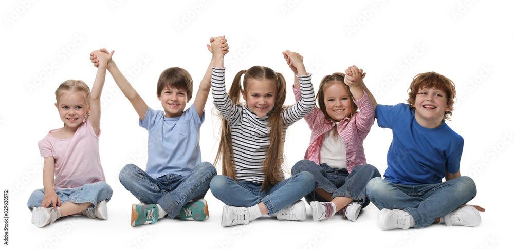 Group of cute children holding hands on white background