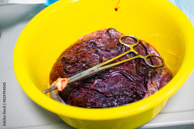 placenta with umbilical cord after delivery