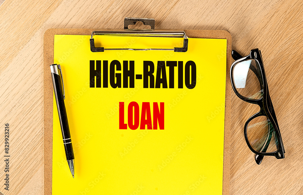 HIGT-RATIO LOAN text on yellow paper on clipboard with pen and glasses