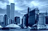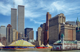 Gescanntes Diapositiv einer historischen Farbaufnahme der Skyline von New York, Lower Manhattan mit Wolkenkratzern und alten World Trade Center, Anfang 1990er Jahre