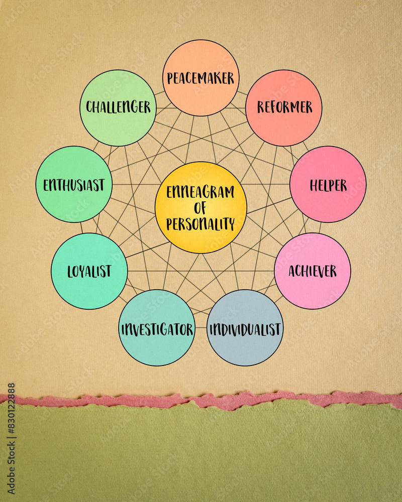 enneagram of personality diagram - nine distinct types and their interrelationships (reformer, helper, achiever, individualist, investigator, loyalist, enthusiast, challenger, peacemaker)