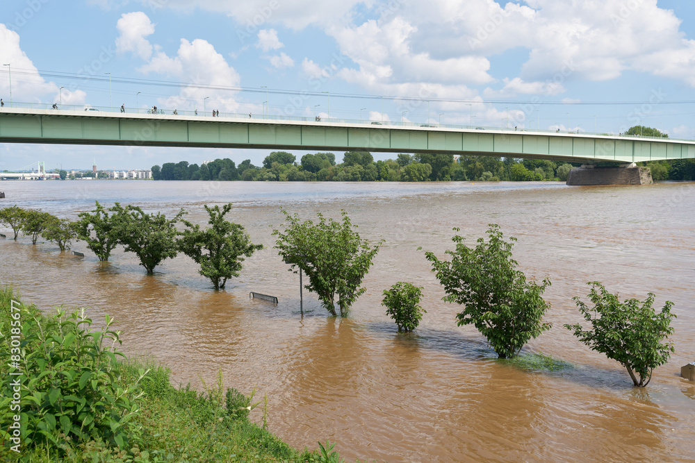 überflutete Promenade am Konrad-Adenauer-Ufer am Rhein in Köln