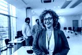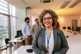 Portrait of older African American businesswoman standing in front of her colleagues.