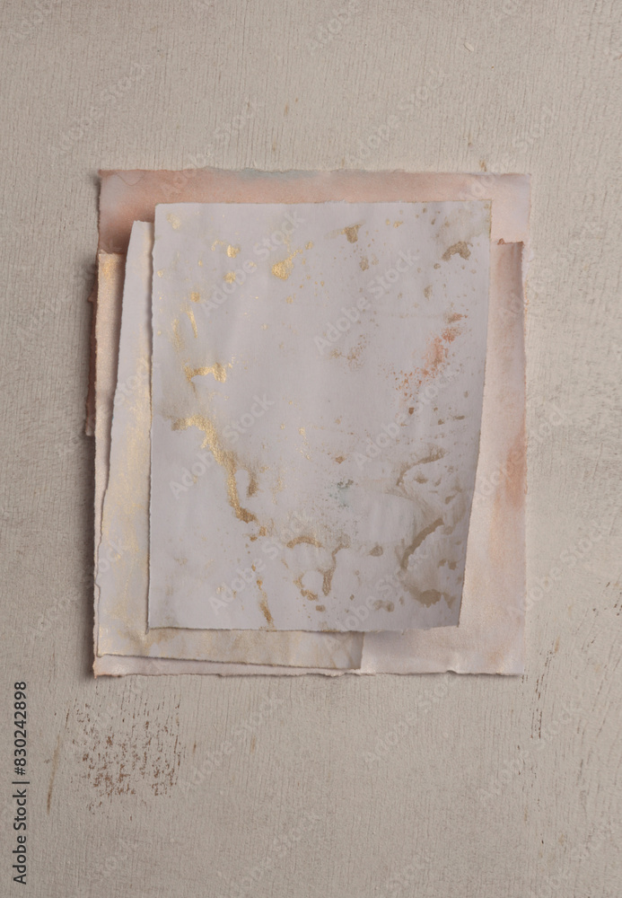 Beige, nacre gold frame painting paper empty card blank on wood wall. Abstract texture copy space neutral grunge background.