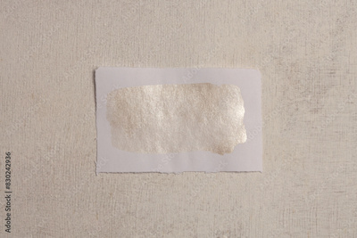 Beige and nacre silver frame painting paper empty card blank on wood wall. Abstract texture copy space neutral grunge background.