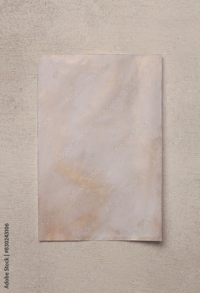 Beige and nacre silver frame painting paper empty card blank on wood wall. Abstract texture copy space neutral grunge background.