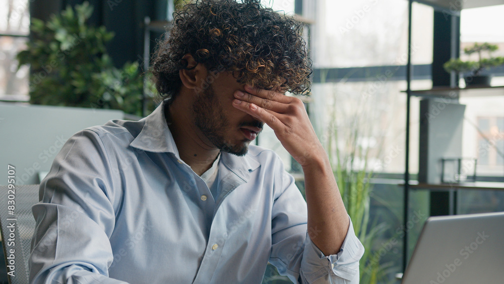Tired man Arabian exhausted Indian latino male business person office worker sick businessman rubbing dry itchy eyes feel eye strain fatigue feel headache bad vision overwork with laptop computer work