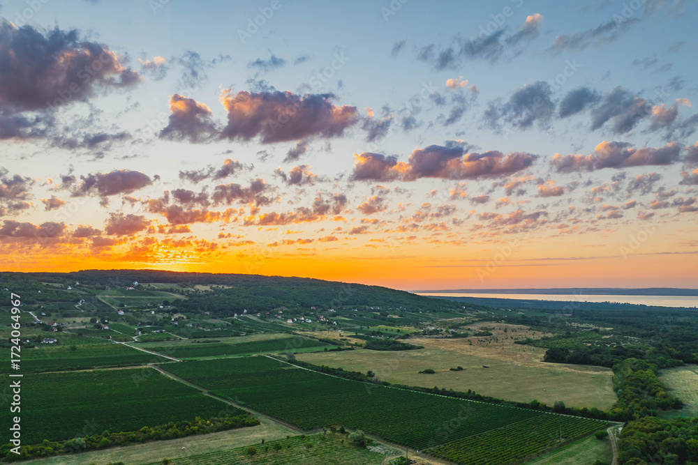 Cyclist on an asphalt bicycle road with colorful red and white parallel barriers. Cycling route between Obrzycko and Oborniki. Summer countryside landscape in Wielkopolska region, Poland.