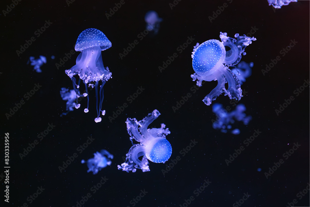 Group of fluorescent jellyfish swimming underwater aquarium pool. The spotted australian jellyfish, Phyllorhiza punctata in aquarium with blue neon light. Theriology, tourism, diving, undersea life.