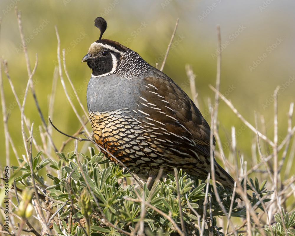 California Quail adult male perched on a shrub. Point Reyes National Seashore, Marine County, California, USA.