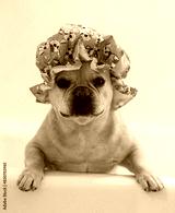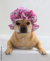 Red Tan Frenchie wearing a shower cap in the bathtub.