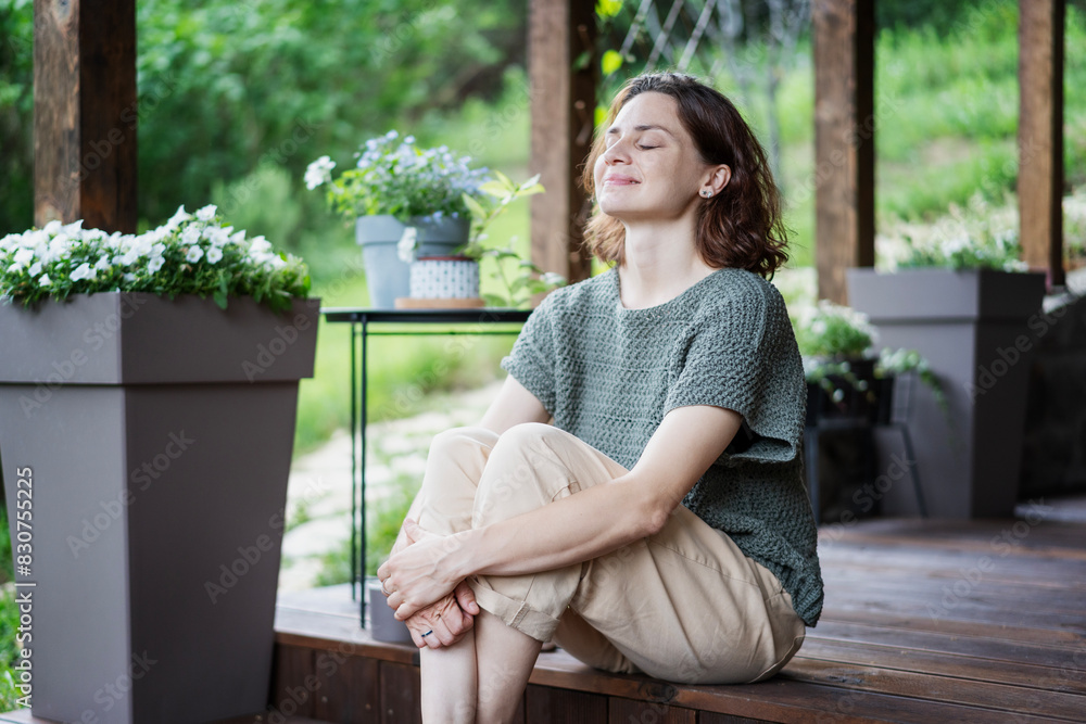 Young happy smiling Caucasian woman sitting on the wooden terrace of a country house enjoying the summer